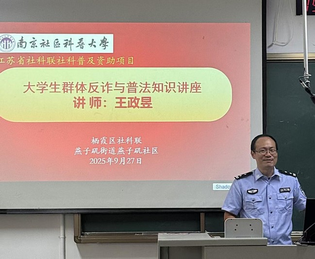 为提升大学生反诈意识与法律素养,9月27日下午,美术与设计学院于博雅楼2204开展大学生群体反诈与普法知识讲座。本次活动由栖霞区社科联、燕子矶街道燕子矶社区联合举办,王政昱警官担任主讲,围绕反诈、高危犯罪防范及自我保护等内容展开。