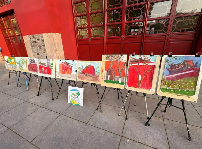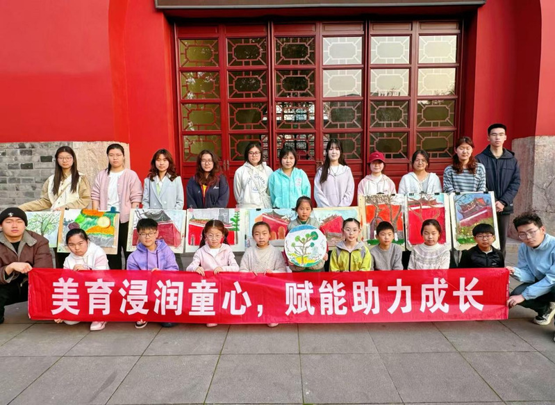 活动伊始,李敏副院长与大学生志愿者们陪伴孩子们漫步鼓楼公园,在青砖城墙、亭台草木间开展沉浸式实景观察。志愿者耐心引导孩子们关注细节、感受光影变化与空间层次,帮助大家建立对自然与城市景观的整体认知,为艺术创作积累直观素材与审美体验。
