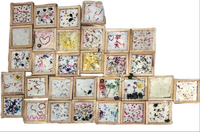 在多多老师的悉心指导下,孩子们尝试制作了独特的花草纸和毛线纸。他们小心翼翼地将精心挑选的干花、细叶,或色彩缤纷的毛线,铺撒在均匀的纸浆上。抄纸帘在水中轻轻起落,花瓣与彩线被温柔地包裹、定格,形成独一无二的肌理。一位孩童兴奋地举起自己制作的半透明花草纸,阳光下,花瓣的脉络清晰可见。等待纸张自然风干的过程,充满了期待,指尖触摸着湿润的纸胚,仿佛直接感受到了传统手工艺的温度。