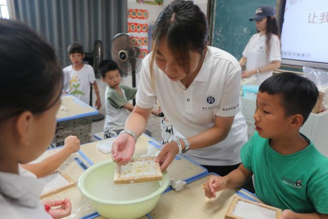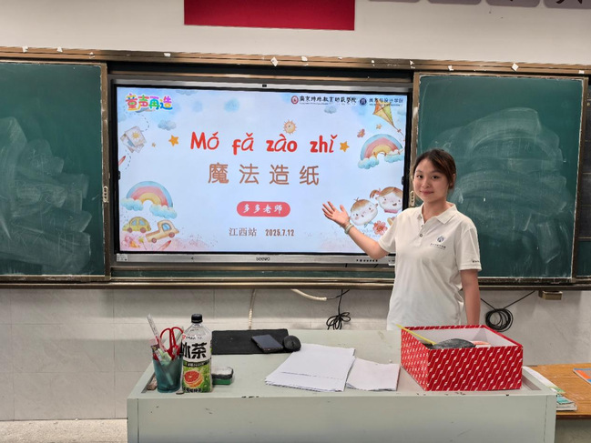 7月12日上午,美术与设计学院黄荣波、戴梦颖老师指导的“童声再造”暑期社会实践校级团队,为江西吉安乡村儿童带来了一场别开生面的“魔法造纸”自然美育活动。团队创新采用“线上+线下”融合教学模式:由团队成员王晨曦(以下简称“多多老师”)现场主讲,李依瑶、卢漫诗、张梦凡、李治宪等线上协同授课,带领孩子们亲手体验造纸技艺的当代新生,在纸浆翻涌间点燃文化传承的创新火花。