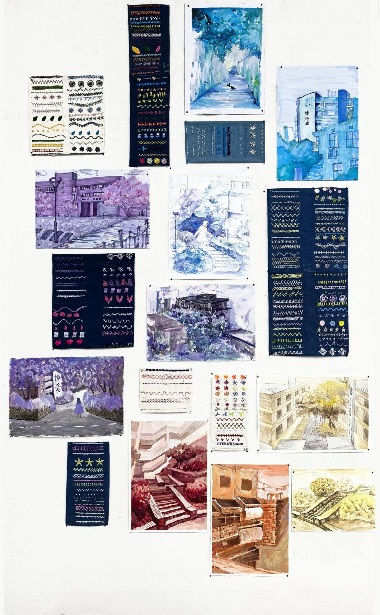 展览以大一《设计色彩》与大二《面料塑形设计》两门核心课程为依托,构建起“基础认知—技能训练—创意融合”层层递进的教学路径。《设计色彩》课程注重夯实学科根基,引导学生深入校园自然场景,通过写生捕捉季节更迭中的光影变化,将自然色彩提炼、转化为兼具情感表达与设计逻辑的服饰色彩语言,系统塑造学生的色彩素养与审美判断力;《面料塑形设计》课程则聚焦专业能力进阶,以面料材质与形态的再造为核心,鼓励学生运用刺绣、编织、拼贴等多元手法,实现从二维平面到三维立体的创意跨越,并有机融合前期色彩课程成果,展现知识衔接与能力贯通的育人成效。