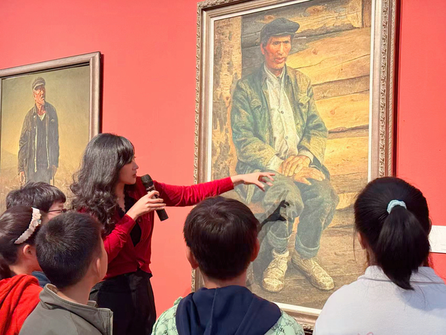 活动伊始,于莉老师带领孩子们走进画展核心展区。她以“色彩与笔触里的生命温度”为切入点,引领孩子们赏析每一幅作品。画家未用华丽配色,却以质朴笔触让画中人物眼里的光鲜活灵动,这正是“朴质的诗性”的精髓——无需刻意装饰,真实生活本身即是美。大学生志愿者们蹲身陪伴,为孩子们细致指认画面细节:皲裂的手掌、沾着泥土的裤脚、被风吹乱的围巾……这些“不完美”的细节,在于莉老师的解读中成为“生活最生动的注脚”,让孩子们读懂了平凡生命里积极向上的生活态度,完成了一场深刻的生命启迪。