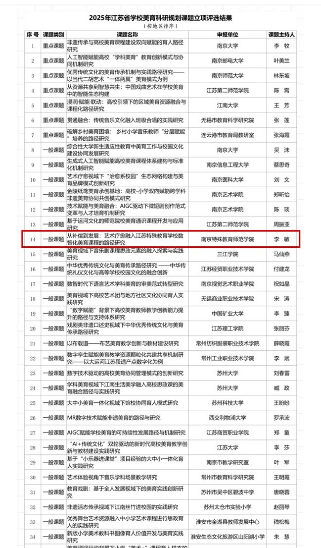 近日,江苏省学校美育教学指导委员会公示2025年省学校美育科研规划课题立项评选结果。我校美术与设计学院组织申报的课题《从补偿到发展:艺术疗愈融入江苏特殊教育学校数智化美育课程的路径研究》(项目负责人:李敏)成功获评2025年江苏省学校美育科研规划一般课题。
