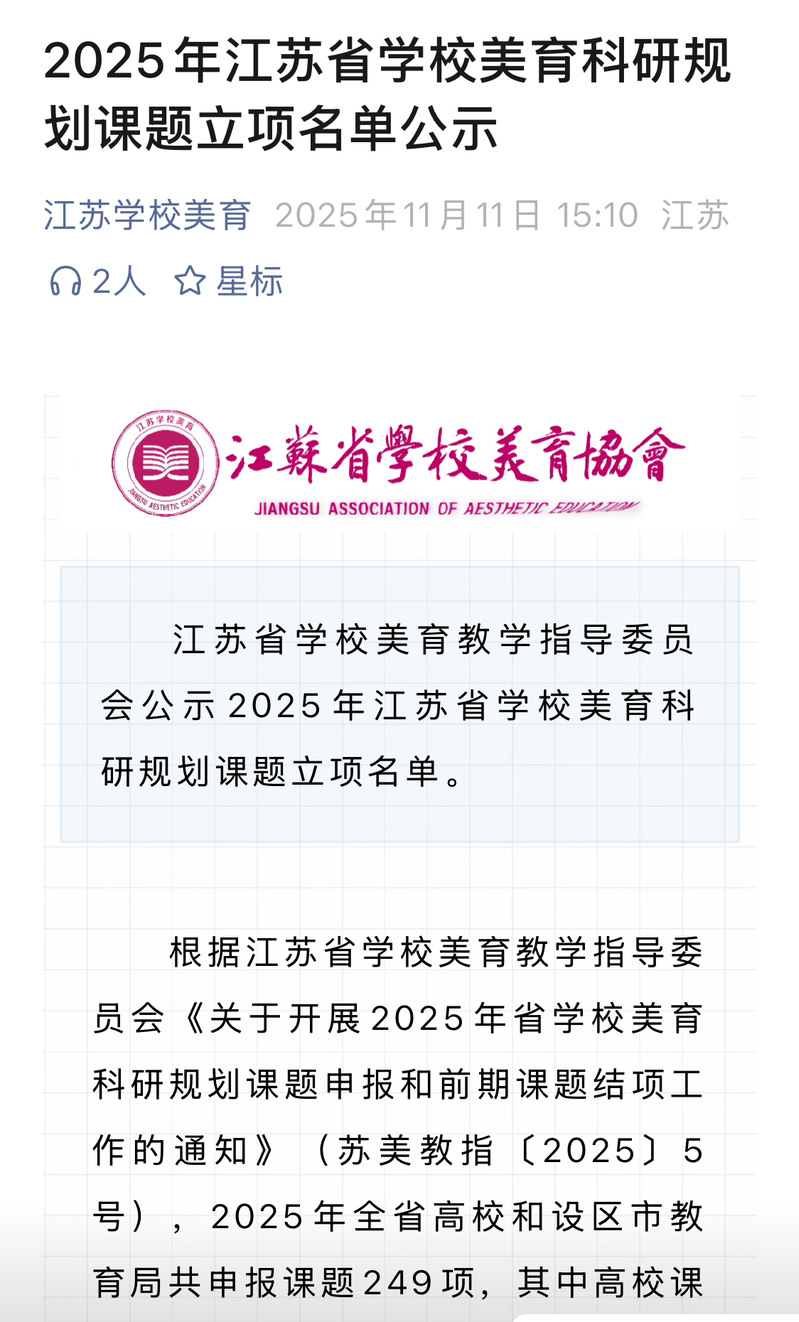 江苏省学校美育教学指导委员会发布《关于开展2025年省学校美育科研规划课题申报和前期课题结项工作的通知》(苏美教指〔2025〕5号),2025年全省高校和设区市教育局共申报课题249项,其中高校课题199项,中小学课题50项。经省学校美育教学指导委员会组织专家评选,拟项课题37项,包括重点课题7项、一般课题30项。