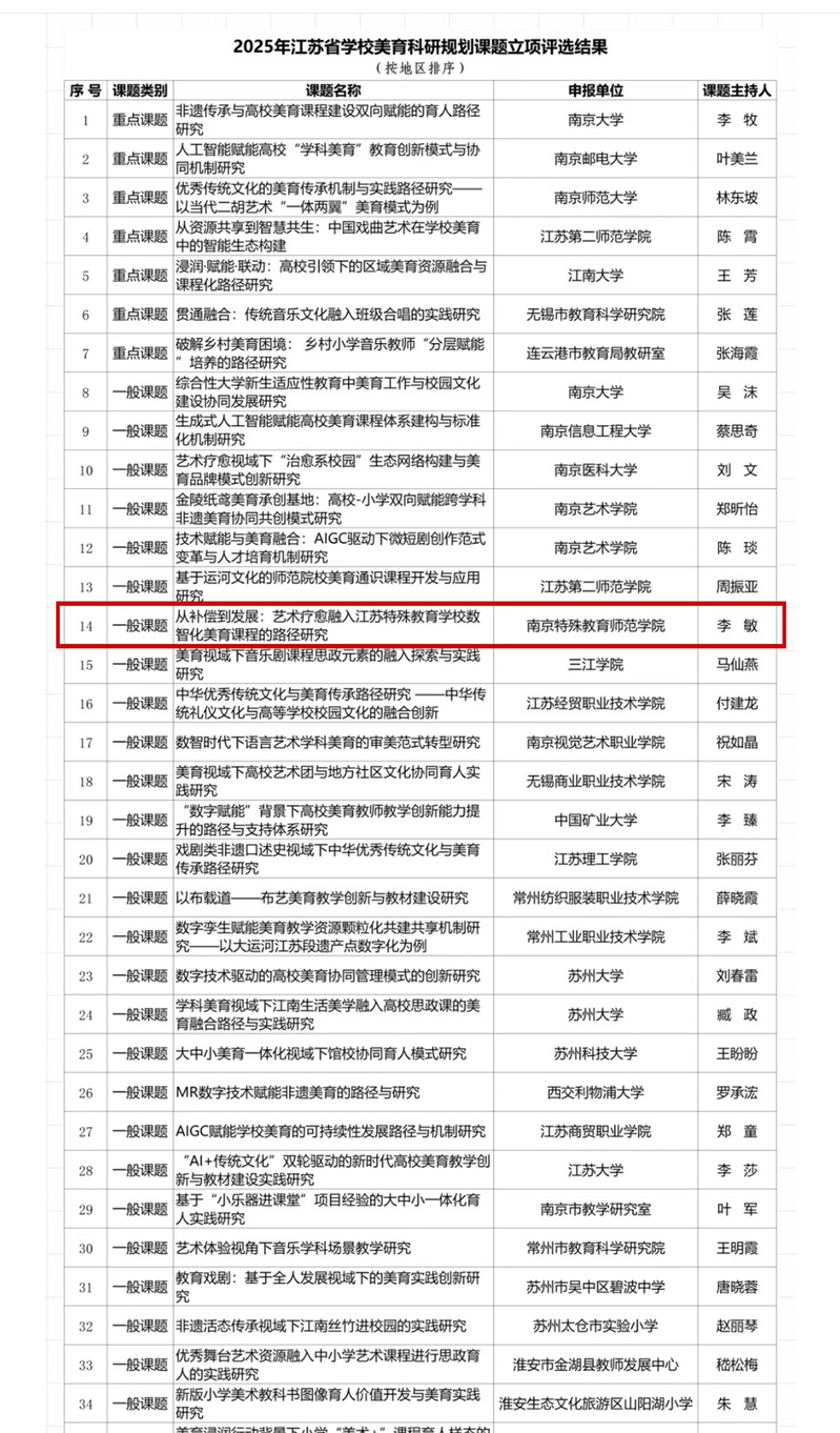 近日,江苏省学校美育教学指导委员会公示了2025年省学校美育科研规划课题立项评选结果,南京特殊教育师范学院美术与设计学院李敏老师的课题“从补偿到发展:艺术疗愈融入江苏特殊教育学校数智化美育课程的路径研究”获评为2025年江苏省学校美育科研规划一般课题。