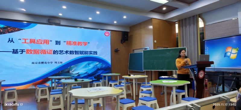 调研期间,团队全程沉浸式参与了樱花小学当日的艺术教研活动:先是聆听樱花小学周文敏老师带来的《从“工具应用”到“精准教学”,基于数据循证的艺术数智赋能实践》主题分享,周老师结合自身教学案例,详解了艺术教育从“凭经验授课”转向“以数据和技术双轮驱动”的转型逻辑,从数字工具的课堂嵌入、学生创作数据的动态采集,到基于数据反馈的个性化指导,生动呈现了数字技术如何助力教学流程优化与核心素养落地。随后,团队现场观摩了北京东路小学陈梦怡老师《会说话的手》和樱花小学刘欣悦老师《剪刀会说话》两节艺术课,课堂上数字画板、创意软件等工具与传统艺术创作结合,既拓展了学生的表达维度,也让教师得以更精准地捕捉学生的创作思路,这一“技术辅助+人文引导”的模式,让调研团队对数字美育的实践价值有了更具象的认知。