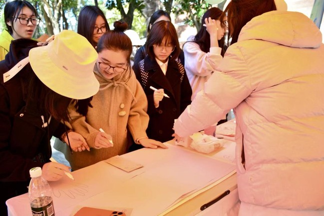 “博爱润心,悦享同行” 主题活动中,开场的 “掌印同心” 游戏迅速拉近距离,参与者手持各色画笔,在同一张画布的核心位置勾勒手掌轮廓,同步写下心愿、祝福或感悟。当不同颜色的掌纹层层重叠,线条交织间传递着陌生人间的心灵共鸣,一幅凝聚着同心力量的画作悄然成型。随后的“寻找有缘人”环节氛围热烈,工作人员组织参与者围坐互动,大家循着眼缘自主结对,在轻松交谈中挖掘彼此的共同点:从专业兴趣、作息习惯到小众爱好,不少同学惊喜地发现 “原来这里有同好”,欢声笑语中打破了陌生壁垒。两场活动层层递进,让同学们在互动中释放情绪、收获认同,将细碎的温暖与真诚的联结深深记下,为这场以“爱”为名的相聚留下了暖心注脚。