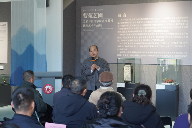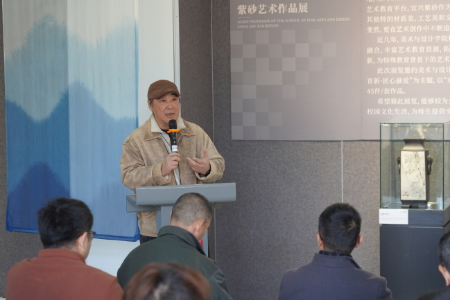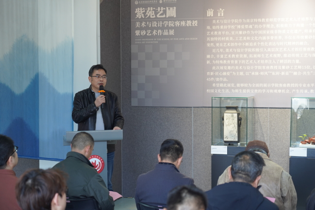 开幕式伊始,赵健院长向与会嘉宾的到来表示热烈欢迎,并简要阐述了学院举办此次展览的初衷——旨在搭建一个展示、交流与教学的立体平台,让紫砂这项厚重的非物质文化遗产在高等艺术教育,特别是特殊教育语境中焕发新的生命力。随后,特邀嘉宾何晓佑教授致辞。他高度评价了南京特殊教育师范学院美术与设计学院在推动产教融合、引进行业名家深耕教学方面取得的显著成效。他指出,紫砂艺术不仅是工艺技术的凝结,更是中国哲学与审美精神的载体,将其引入大学课堂,尤其是与特殊教育理念相结合,对于培养学生的专注力、创造力和文化自信具有独特价值,是“以美育人、以文化人”的生动实践。