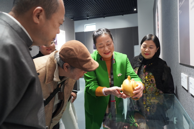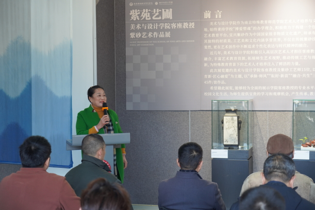 随后,正高级工艺美术师、江苏省陶瓷艺术名人、学院客座教授陈红梅作为艺术家代表发言。她结合自身从艺与教学的双重经历,分享了紫砂创作中“师古”与“育新”的感悟。她认为,紫砂的“匠心”本质与教育所需的“爱心”“耐心”天然契合,每一件作品背后,都是技艺的传递与情感的融合。